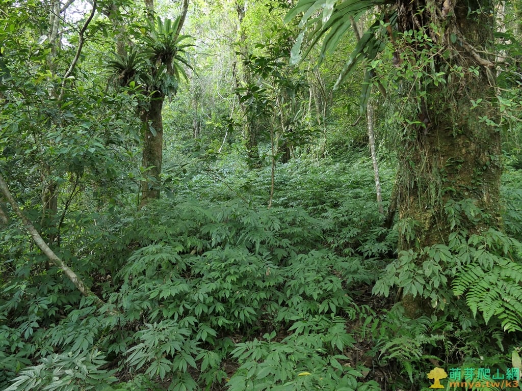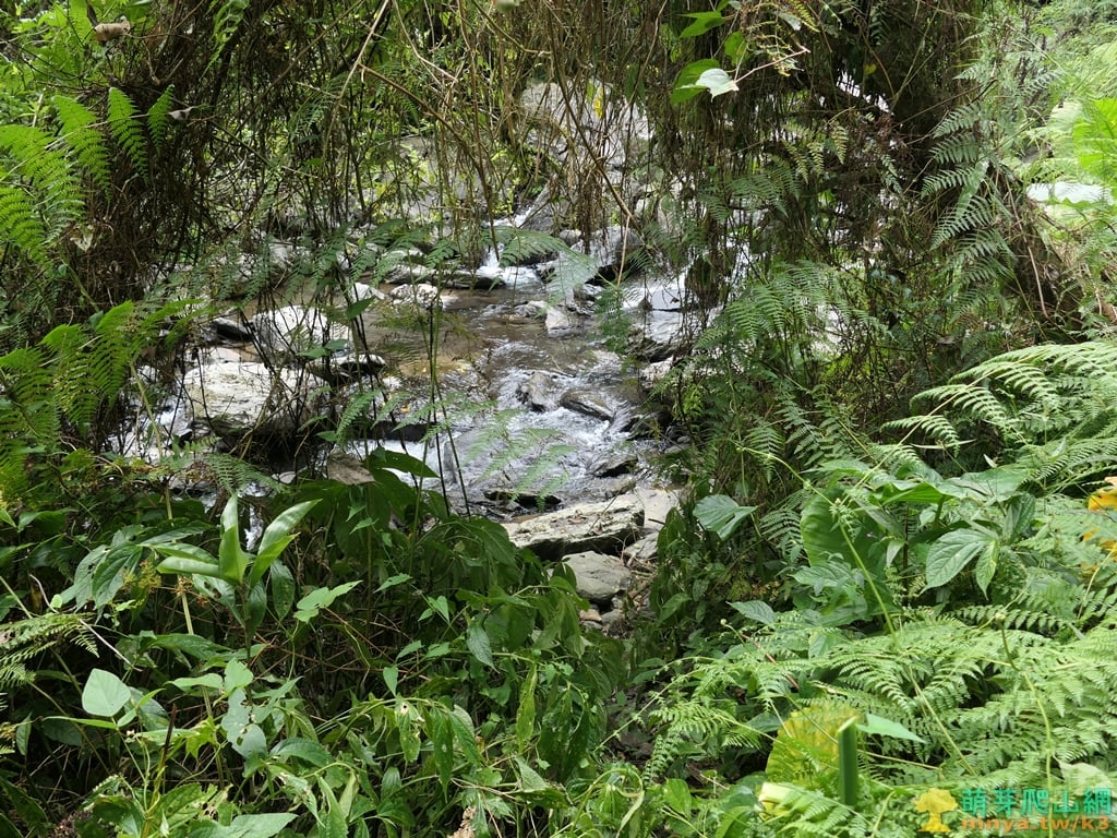 ▲順山腰行越過乾溪溝,谷地山坡長滿樓梯草、蕨草。