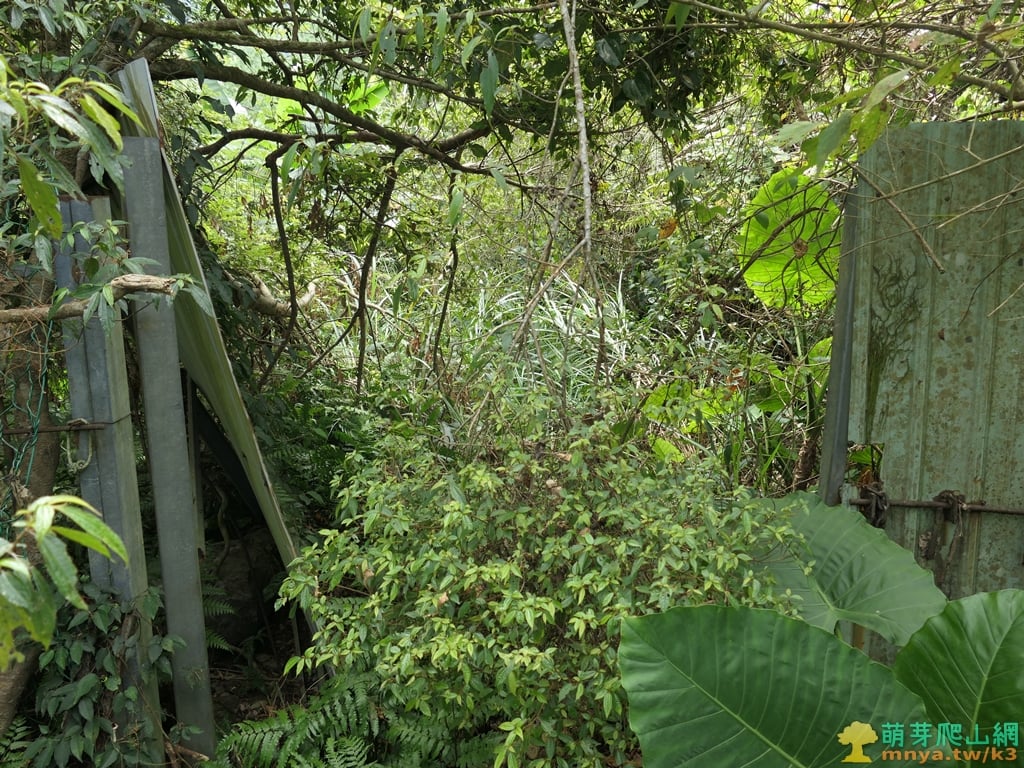 ▲廢土路緩下坡約20公尺穿越一座已倒塌的鐵皮門,取直續行已長滿雜草的廢土路。