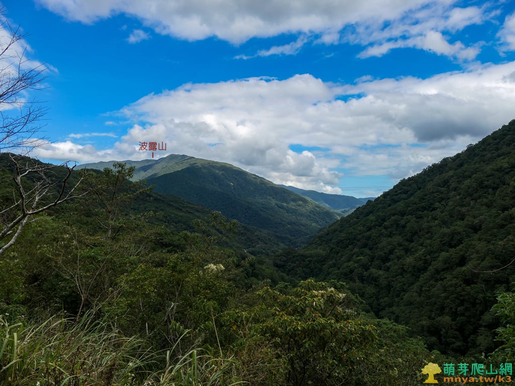 ▲前行道路左側展望,俯瞰大羅蘭溪與福山部落,東邊可以眺望波露山(1418M),波露山南邊(右側)為南勢溪谷,為哈盆越嶺古道通往宜蘭的方向。