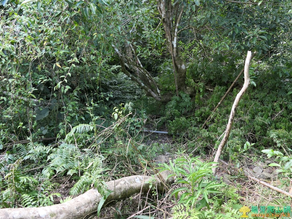 ▲朝西北方向鑽過一片雜叢,見駁坎地還有廢棄的水管線,有路跡與路條可循。