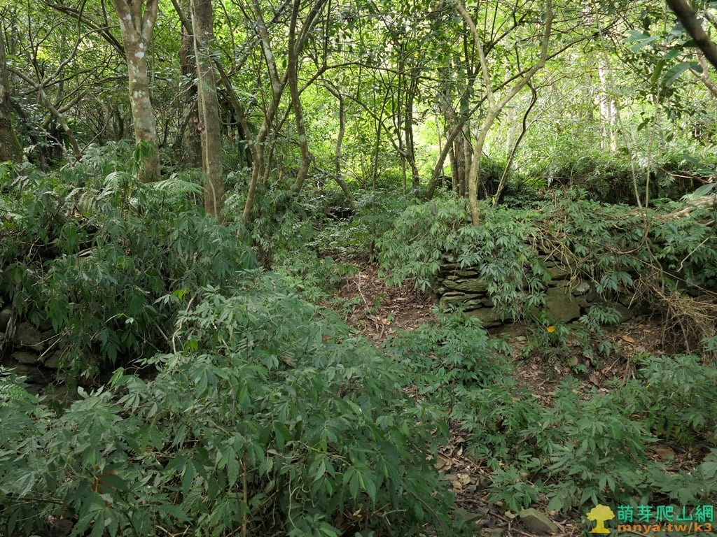 ▲前行右側大石駁坎,地圖上有畫分岔,但現場看已荒煙蔓草完全看不出有岔路。