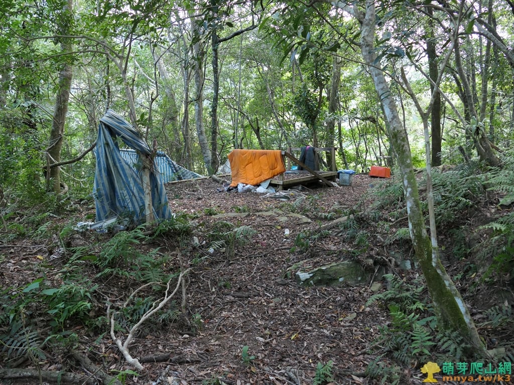 ▲14:56,前行至廢棄獵寮,中間有個像是床架的木造檯子,紅色塑膠條只綁到這,此處高約740公尺,直距馬岸山約0.7K。