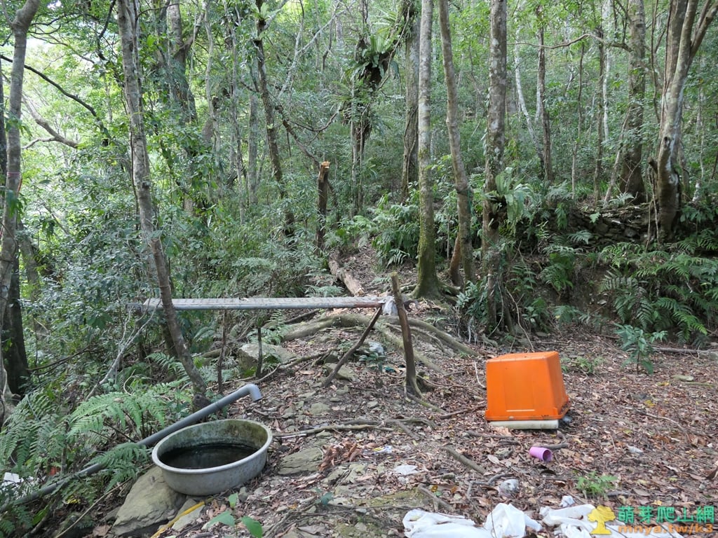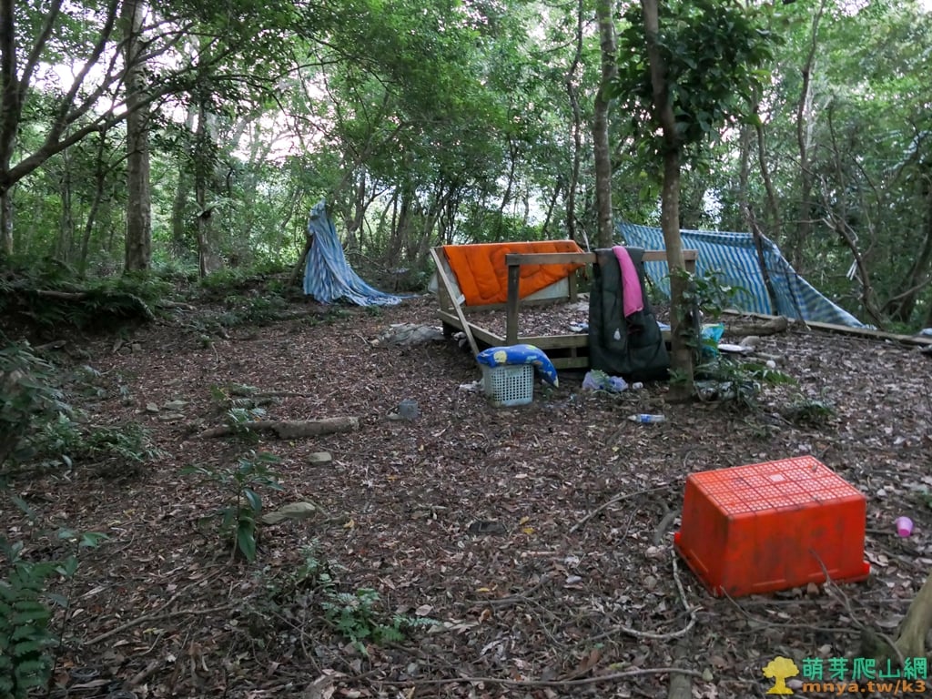 ▲14:51,山坡向上兩側皆是階梯式駁坎,續行取左沿台階橫切,而右側的平台上則有一堆鍋碗瓢盆營地。