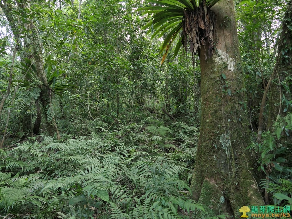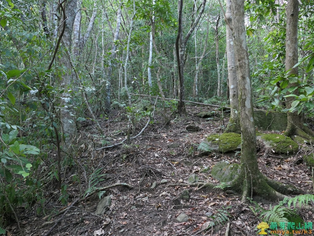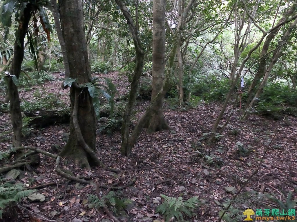 ▲斜行陡上過後,上至一處緩坡,此處在地圖有畫一條路徑向上,但現場看毫無路徑只能繼續沿山腰橫行。