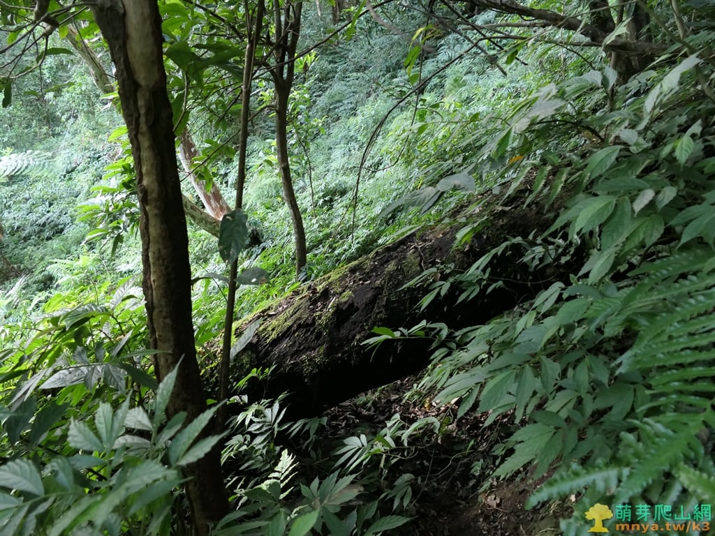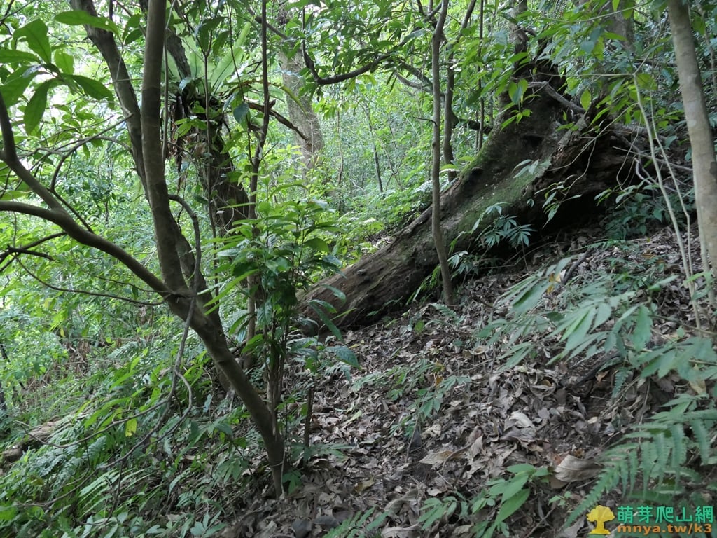 ▲向北直上山坡,有一些舊路條可見路線無誤,剛陡上就先跨越一棵倒木。