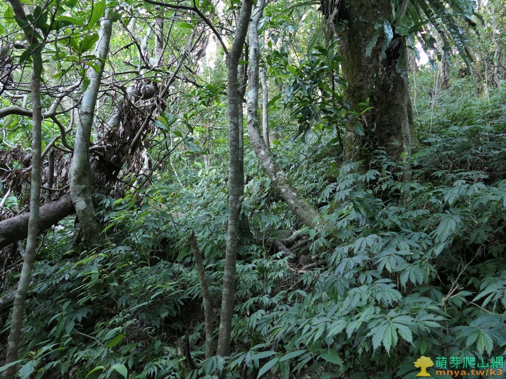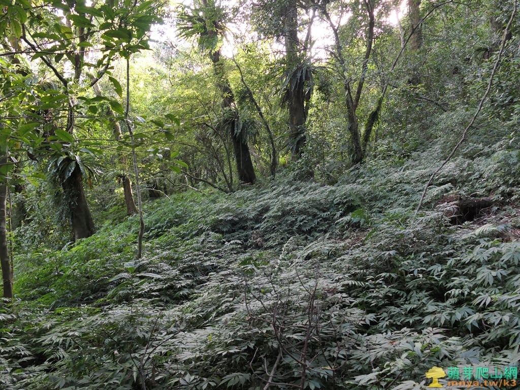 ▲順著山坡走斜的向上,路徑不太清楚跟緊路條走,這片山坡應該也是舊墾地林相雜亂。
