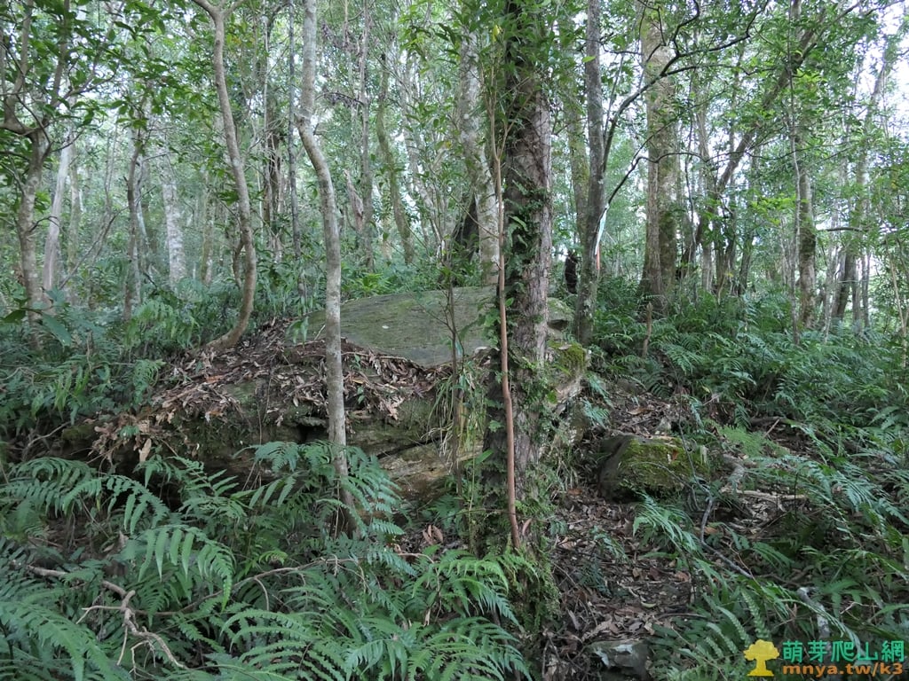▲沿寬敞支稜上行經一顆大石頭,再往前不遠就是基石所在地了。