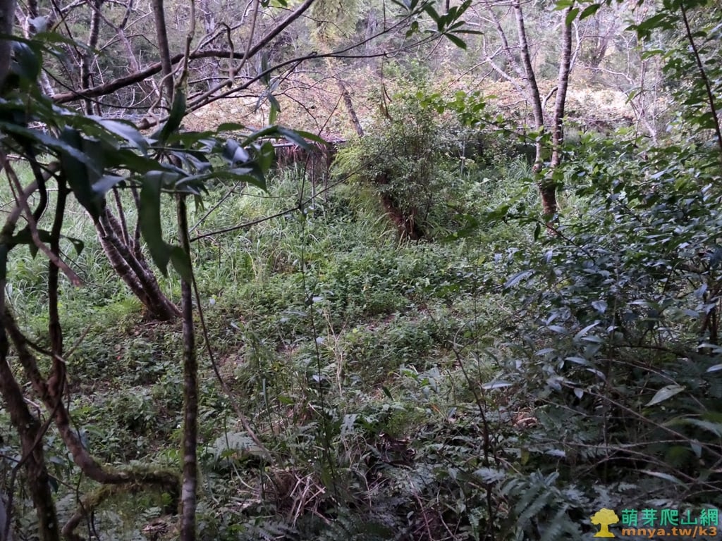 ▲17:34,經駁坎地回鍋碗瓢盆營地前,順駁坎間的斜坡向右下行,林下已相當昏暗。