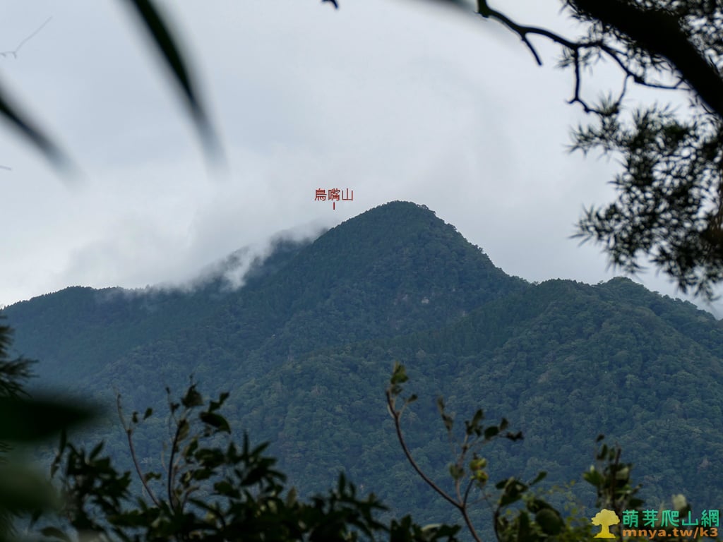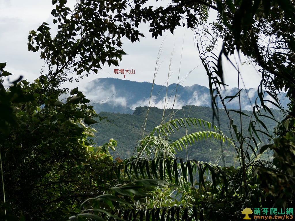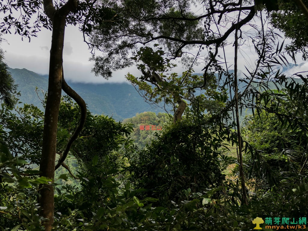 ▲稜左樹叢間,可眺望東南方向的蕃婆石山(620M),其後方雲層裡的山稜為鵝公髻山至鳥嘴山的稜線。