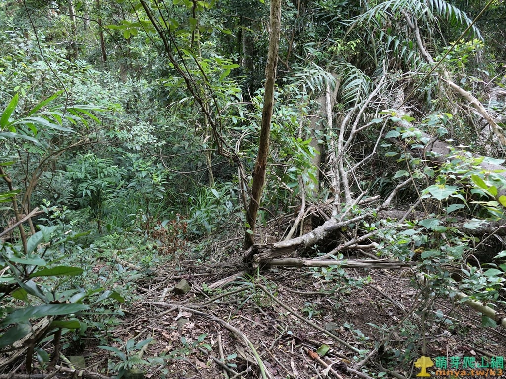 ▲上行土路有不少已清理過的枯枝倒竹,左彎至一片平台,取直緩下沿山腰走。