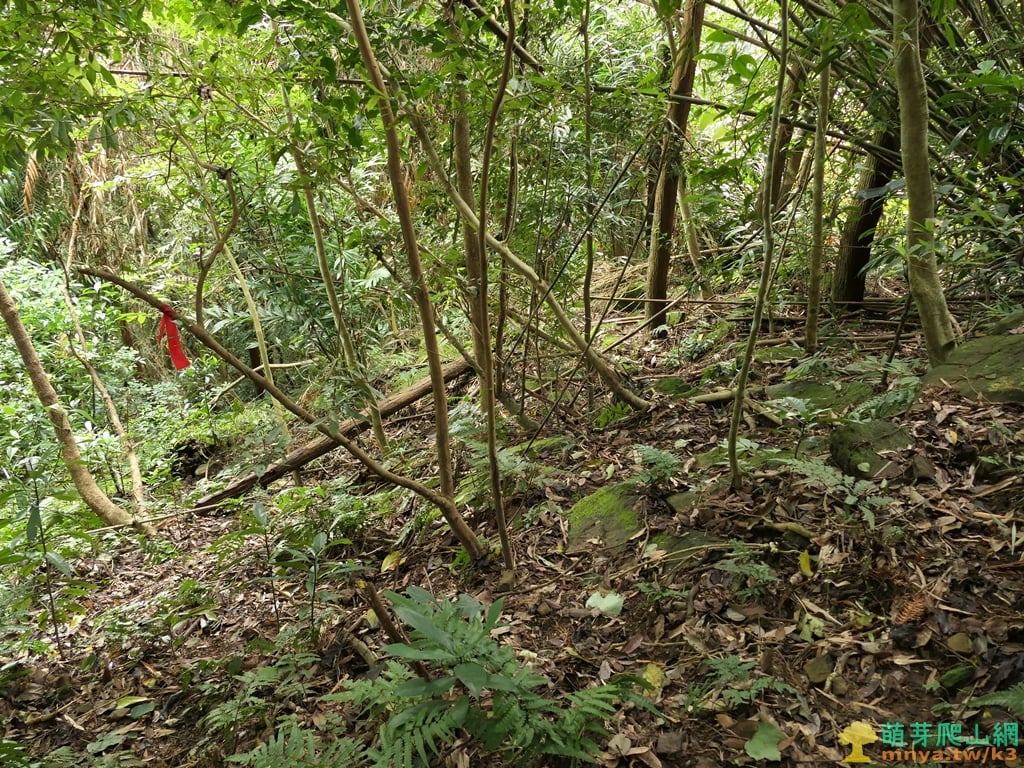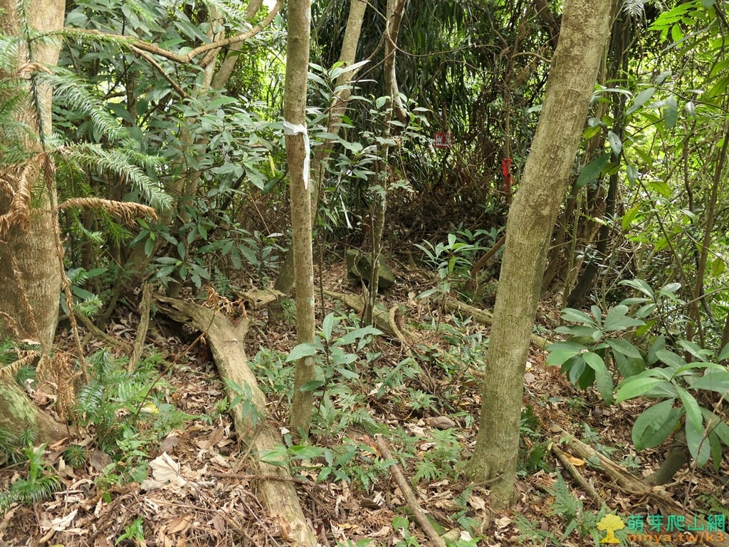 ▲順稜轉下坡,一旁樹上釘有指標回往橫屏背山。