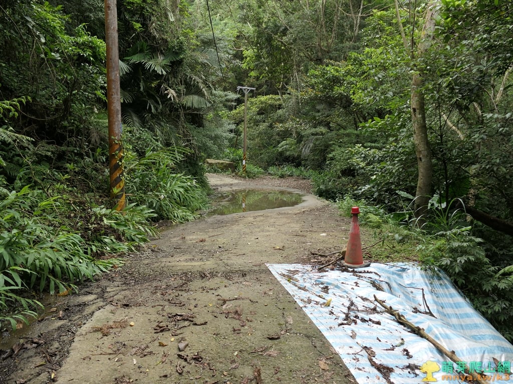 ▲14:28,陡上坡至0.75K經右側小崩塌地,有用帆布與三角錐擋著,往前越過水坑續行更顯破碎的水泥路,此處是之前爬橫屏背山、橫屏背山南峰時的停車處(電桿橫屏13支22)。