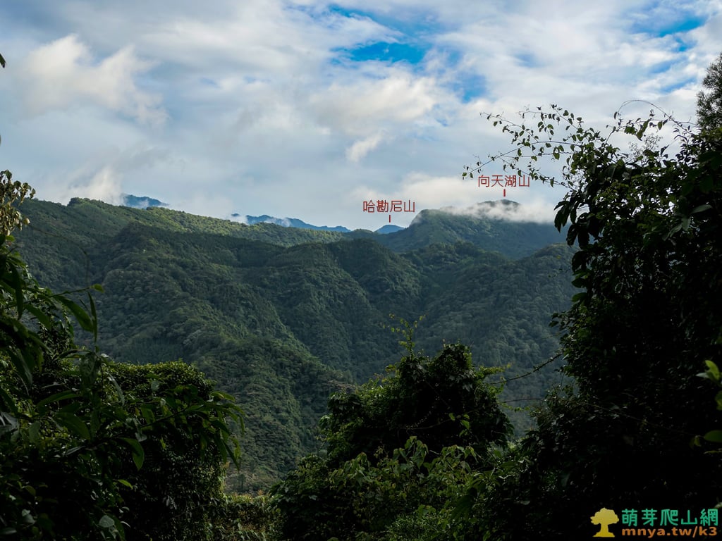 ▲拉近眺望小百岳之一的向天湖山(1245M),沿稜向南是往加里山的方向,稜後可見風美溪一側的哈勘尼山(1990M)。