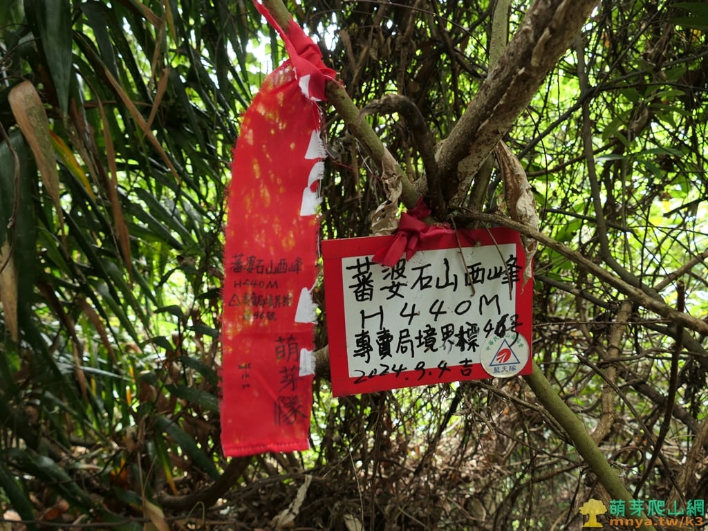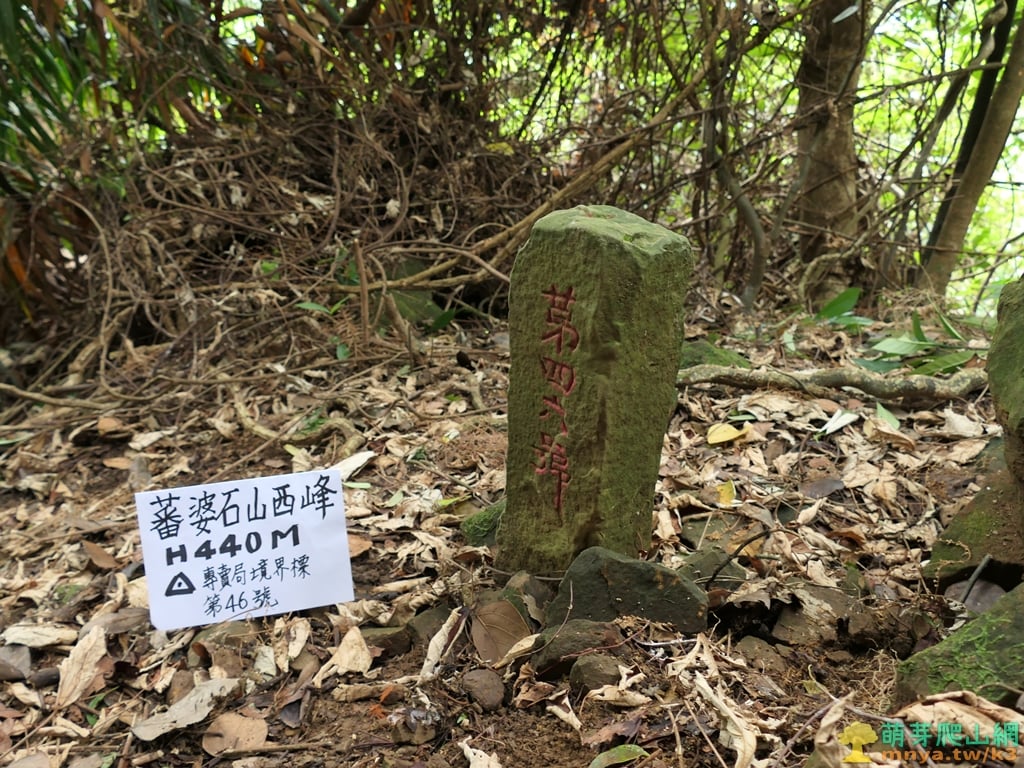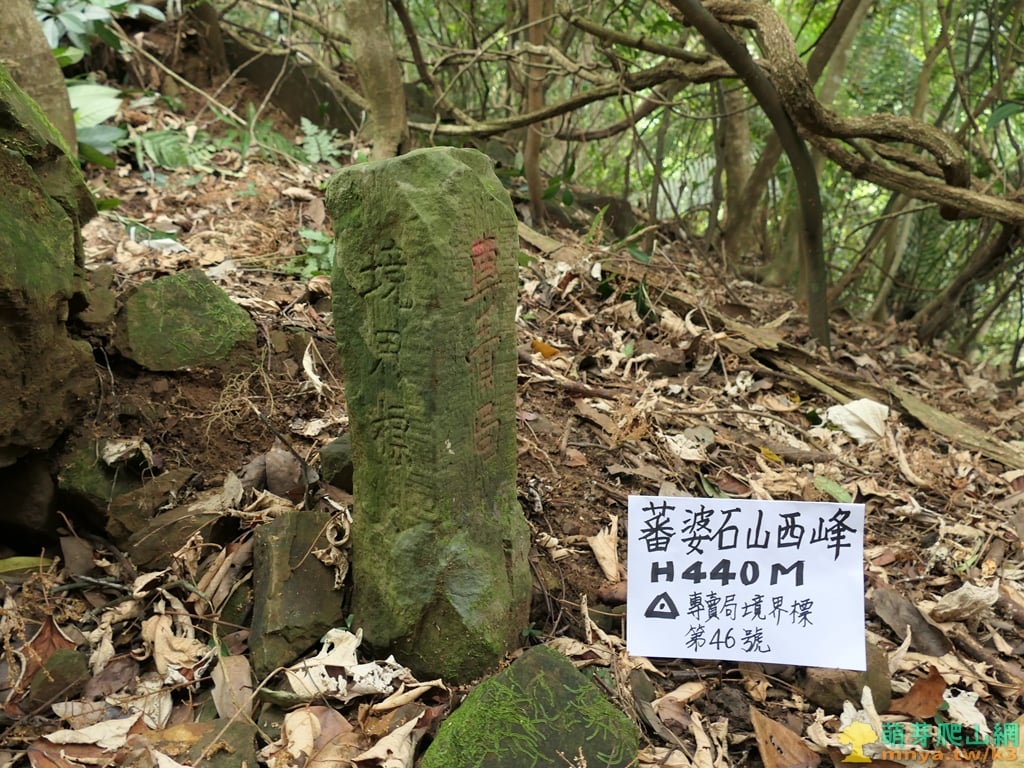 蕃婆石山西峰 標高440公尺 專賣局境界標第46號 座標 : 252031, 2722280;24.6054137, 121.0282523