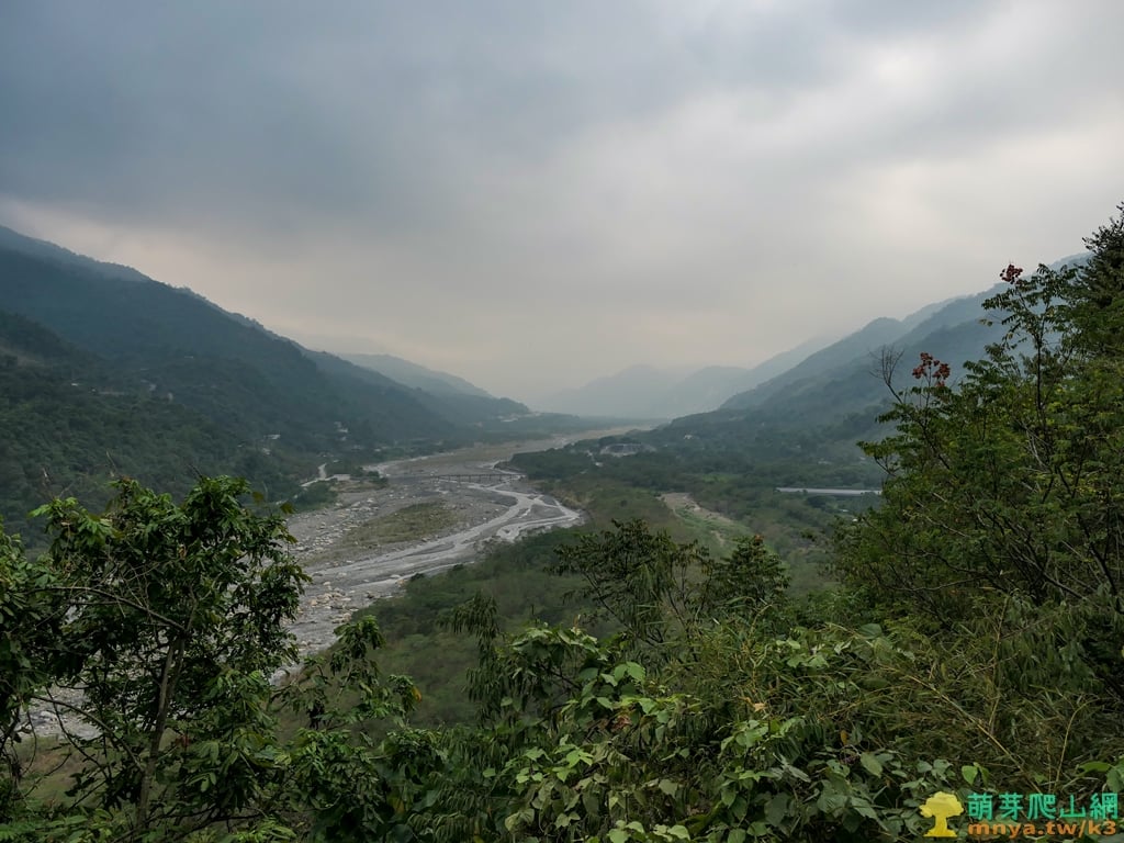 ▲廟前平台展望,往南眺望陳有蘭溪往信義鄉的方向,溪谷兩側高山雲霧籠罩,天空顯得陰沉沉的。