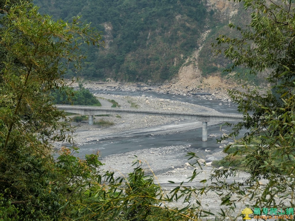 ▲拉近俯瞰跨越陳有蘭溪的砂石車便道橋,溪右岸為台21線(新中橫公路)往郡坑、安村、信義方向。