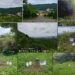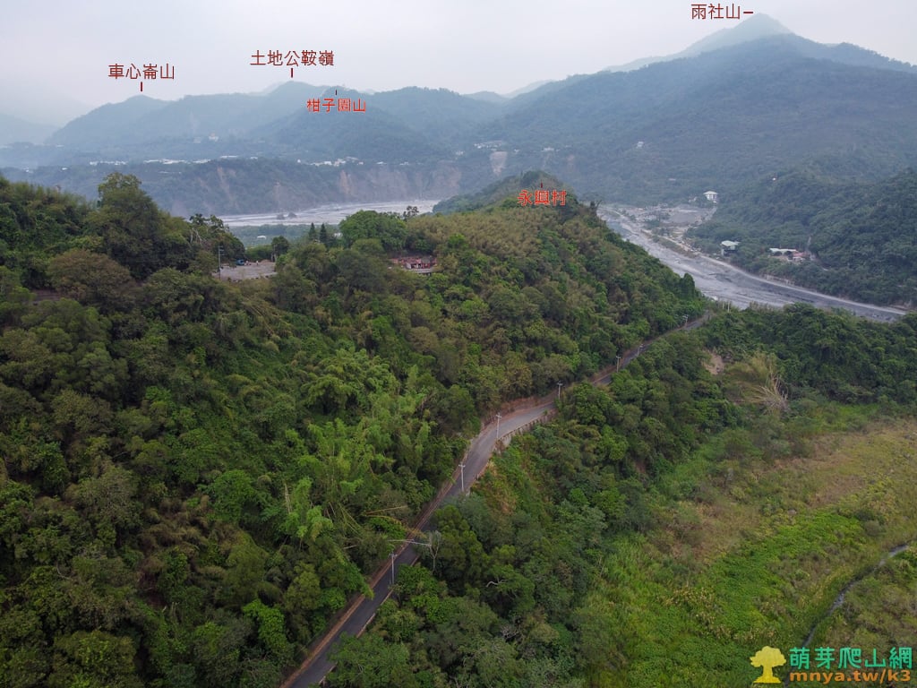 ▲由南向北空拍永興村(405M;台演三角點第十號)之稜線,可見稜旁的永隆宮、十二故君祠,山坡下為投59線(林朋巷),遠眺濁水溪另一側的群山,分別可見:車心崙山(672M)、土地公鞍嶺(713M)、柑子園山(634M)、雨社山(964M)。