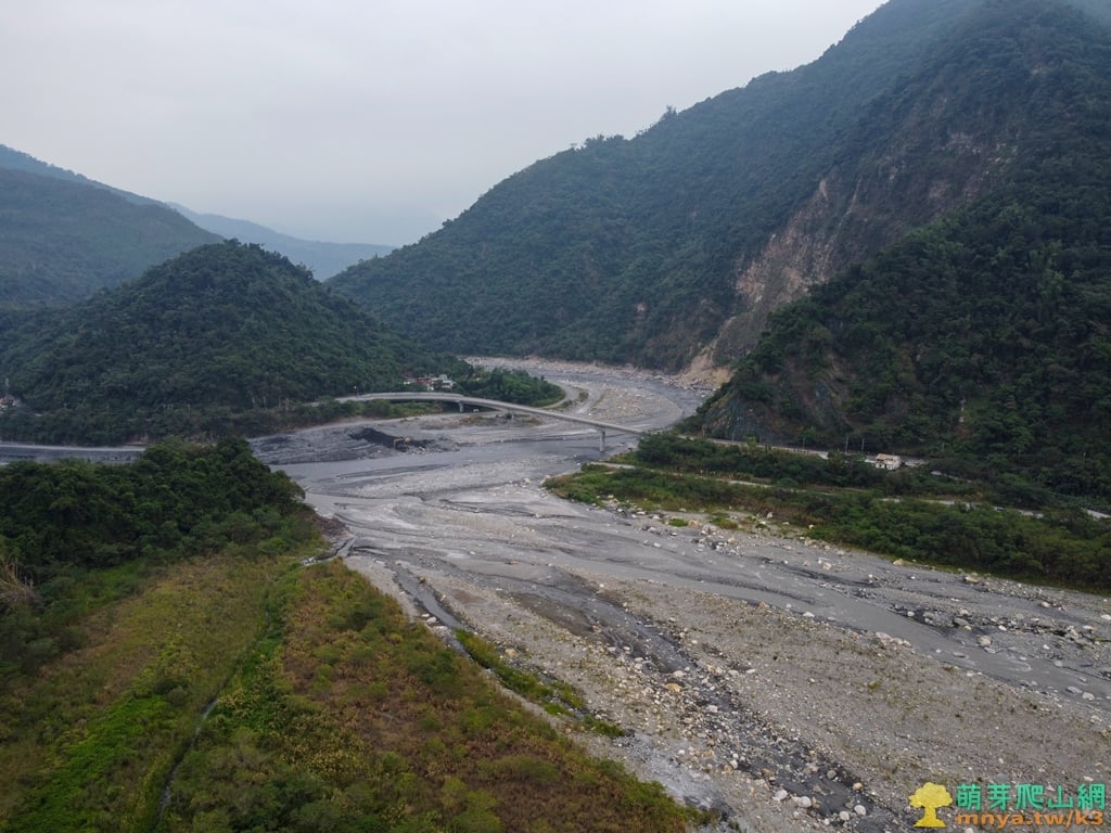▲從坪林林道旁往東俯瞰陳有蘭溪與濁水溪匯流點,可見台21線(新中橫公路)跨越濁水溪之龍神橋,接下來以空拍視角俯瞰大地。