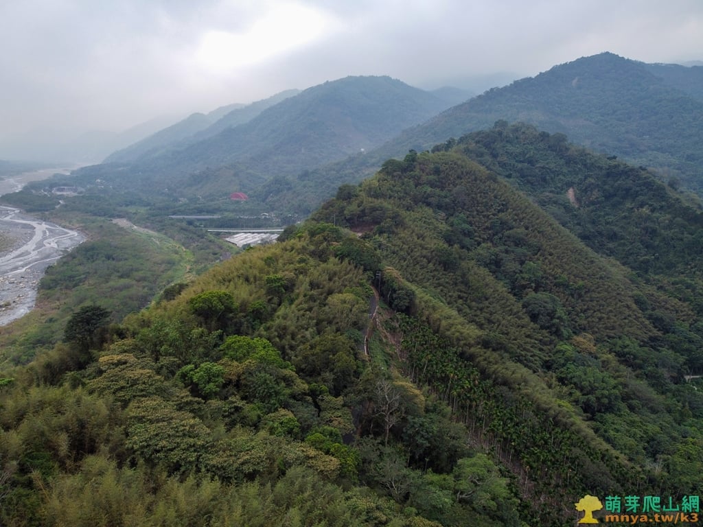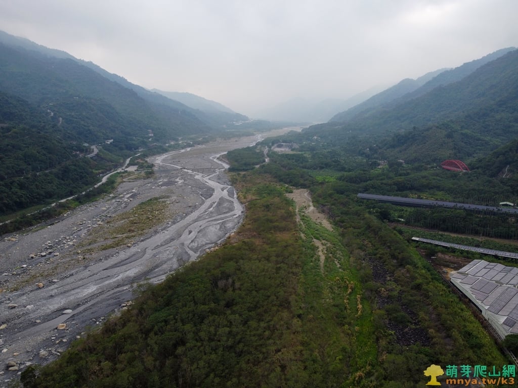 ▲空拍向南俯瞰陳有蘭溪谷,溪左可見台21線(新中橫公路)通往郡坑,右側可見投59線(林朋巷)經興隆往竹子腳,有一座紅色鋼構橋「林朋橋」。