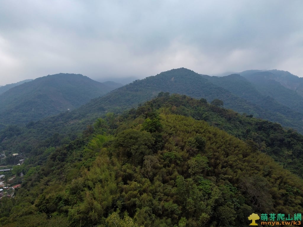 ▲向西南方空拍仰望坪林林道往線浸林道方向的山稜,可見牛轀轆山(759M)往馬路麻山(1232M)的稜線方向,海拔過千的地方雲霧堆積。