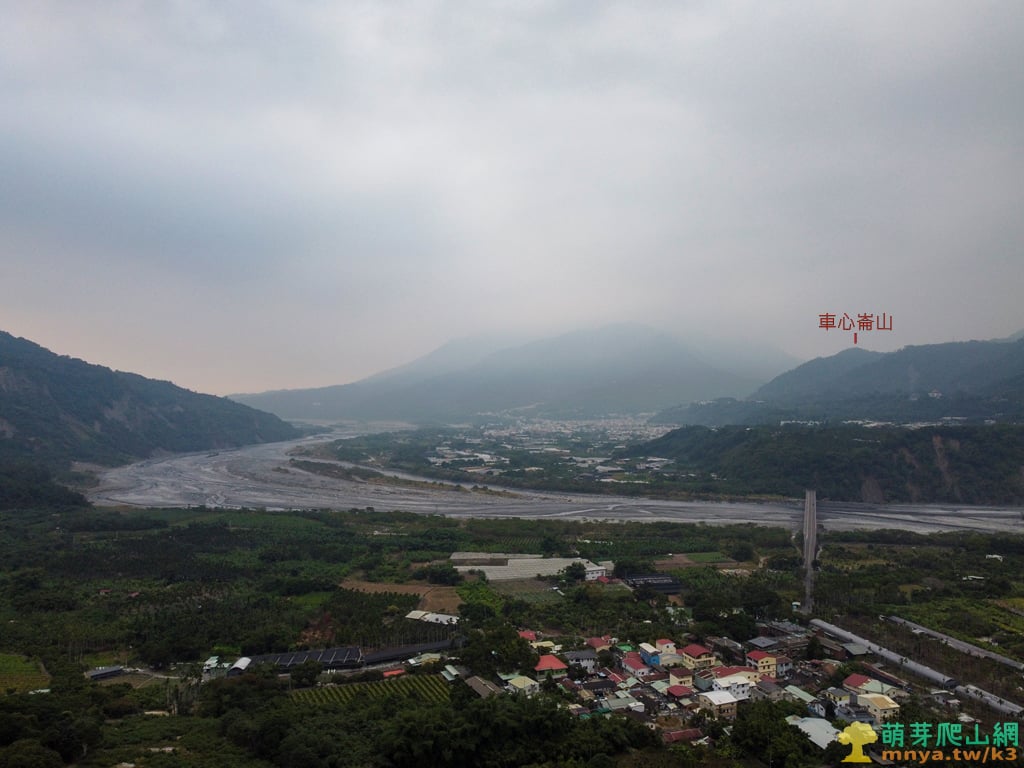 ▲向西北方俯瞰濁水溪另一側的水里市區,山下為永興村,兩地之間由投59線永興橋連接,水里市區後方就是集集大山(1385M)的位置,雲氣太重看不見山頂,右側可見水里溪一側的車心崙山(672M)。