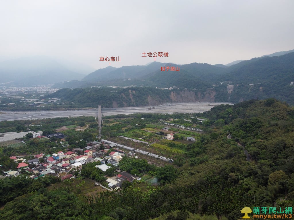 ▲往北俯瞰永興村與投59線跨越濁水溪之永興橋,濁水溪對岸可見水里市區與車心崙山(672M)、土地公鞍嶺(713M)、柑子園山(634M)等山。
