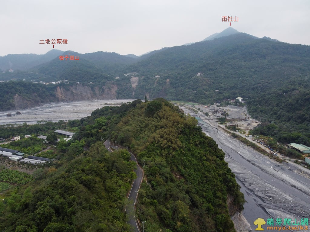 ▲往北俯瞰坪林林道起點與投59線(林朋巷)的岔路口,下方可見跨越濁水溪的永興吊橋,溪對面可見:土地公鞍嶺(713M)、柑子園山(634M)、雨社山(964M)。