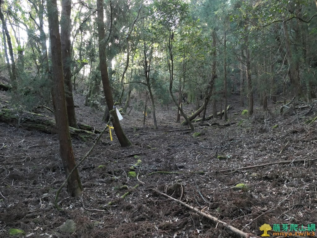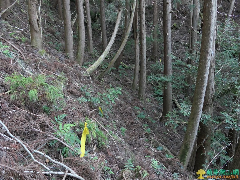 ▲順著山谷陡上,杉木林底只有枯枝落葉,路徑不清楚靠路條辨識方向。