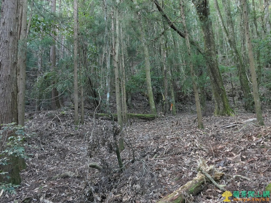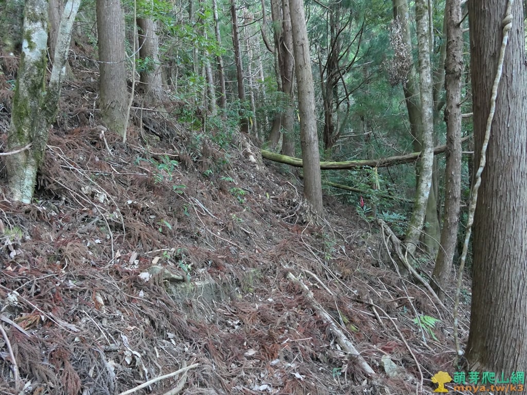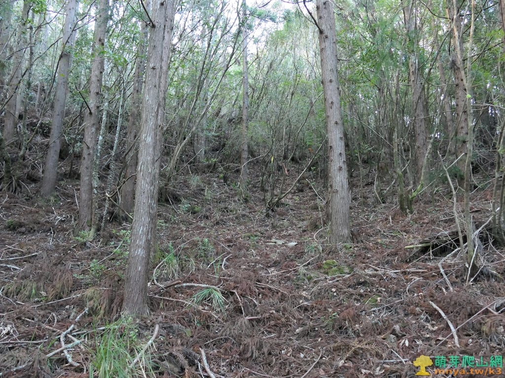 ▲進入人造杉木林經一片平台,取直沿山腰的小徑走有路條可循。