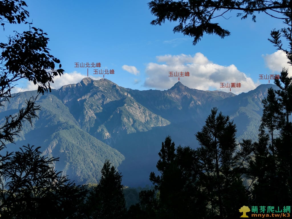 ▲東南方向眺望玉山主峰(3952M)、玉山圓峰(3752M)、玉山西峰(3518M),山頂的雲霧大致散去,群峰景緻一覽無遺。