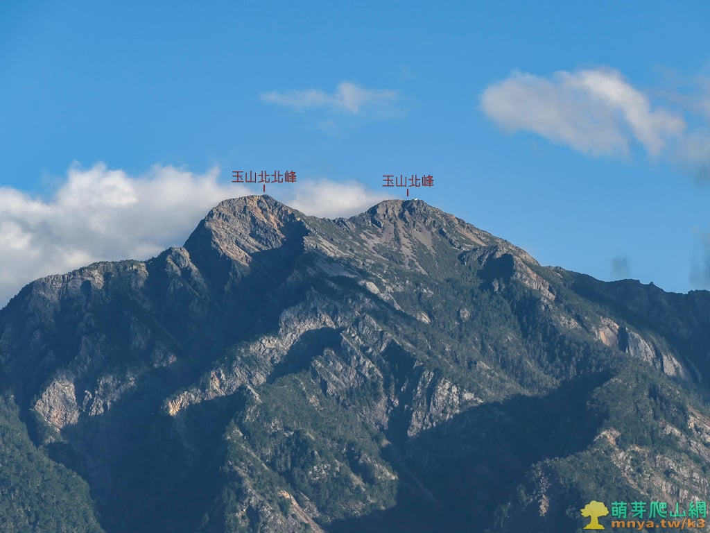 ▲拉近眺望玉山北北峰(3833M)、玉山北峰(3858M),玉山北峰為玉山群峰第四高峰,也是台灣第五高峰,而玉山北北峰雖非百岳,但遠觀雙塔山呈駱駝峰尤為顯眼。
