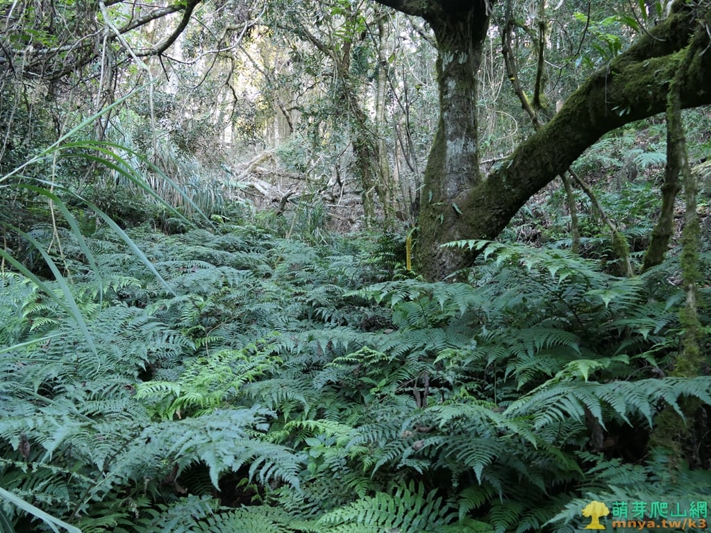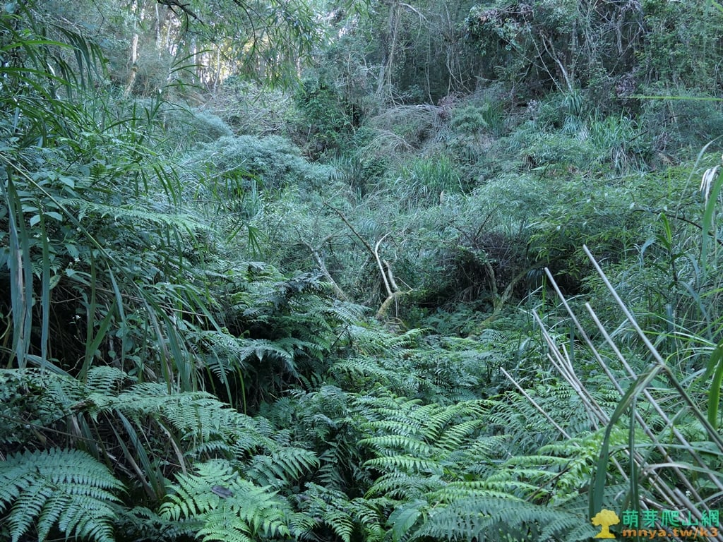 ▲右上山谷間的小徑,前段雜草較多,潮濕的林底長滿咬人貓要特別注意。