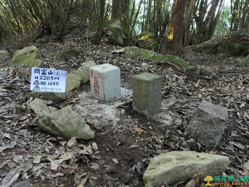 ▲同富山(埔沙山) 標高2285公尺 國測補二等三角點1695號、中華民國六七年一月聯勤測量隊三等三角點內補360號;新中橫15號 座標:238058, 2603907;23.5365425, 120.8911591