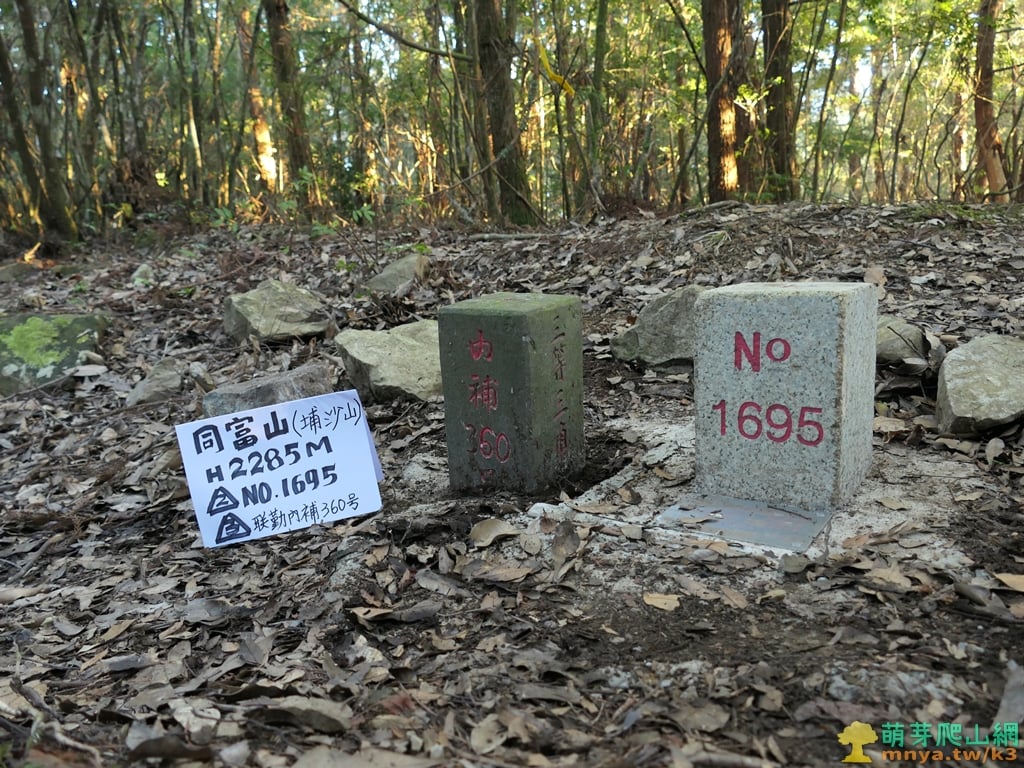 同富山(埔沙山) 標高2285公尺 國測補二等三角點1695號、中華民國六七年一月聯勤測量隊三等三角點內補360號;新中橫15號 座標:238058, 2603907;23.5365425, 120.8911591