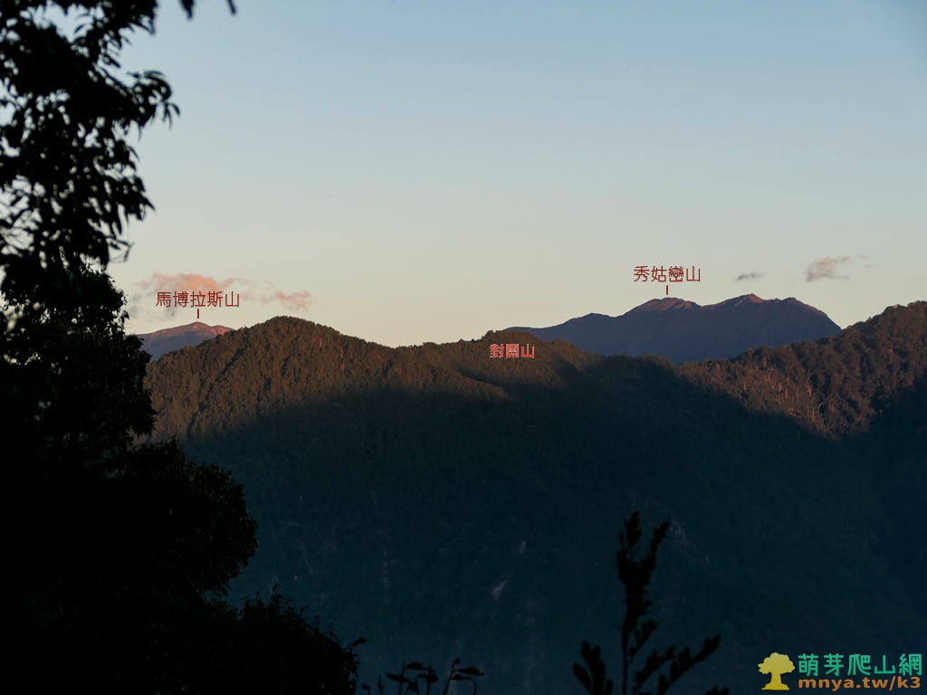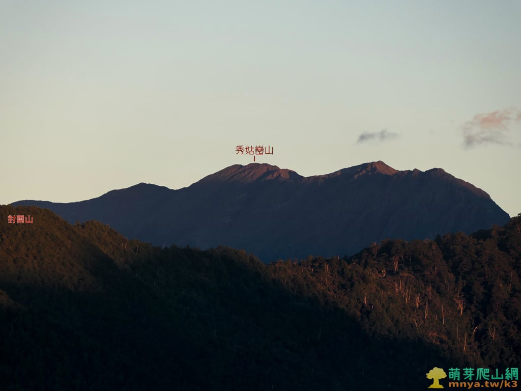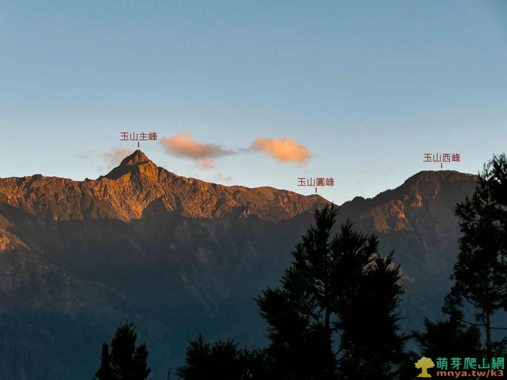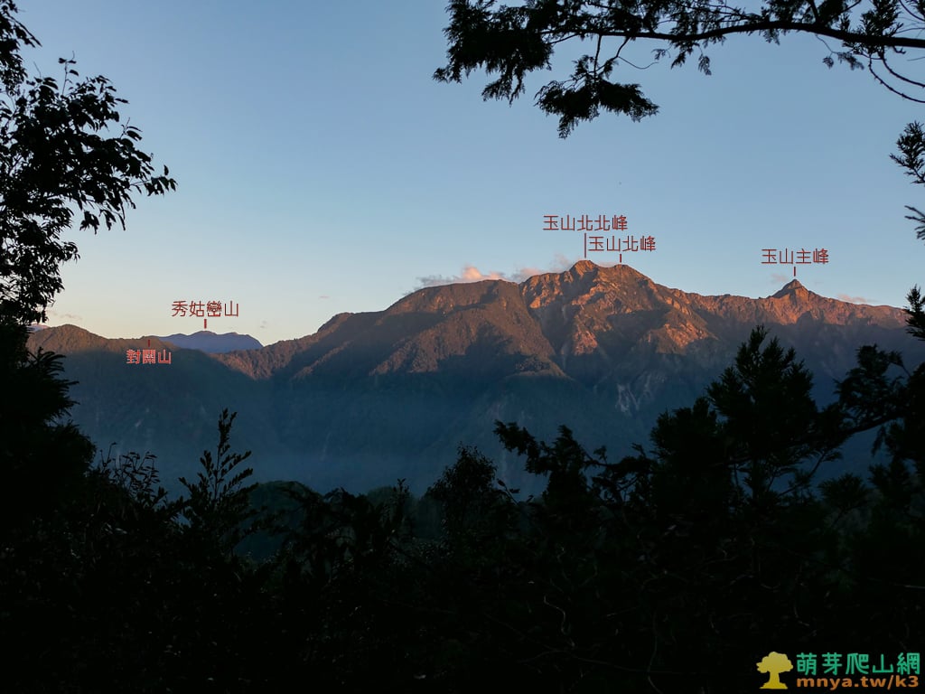 ▲16:56,回山坡展望點,夕陽下的玉山群峰更顯壯觀,玉山山脈連峰可見對關山(2748M)、玉山北北峰(3833M)、玉山北峰(3858M)、玉山主峰(3952M),後方可見中央山脈最高峰秀姑巒山(3829M)。