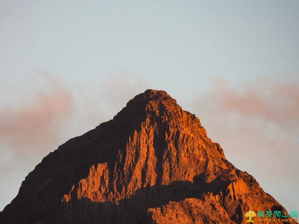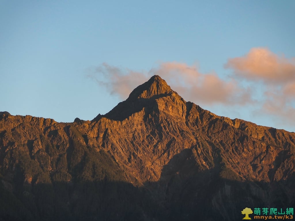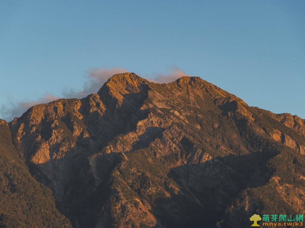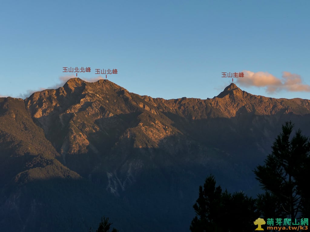 ▲拉近看玉山北北峰(3833M)、玉山北峰(3858M)、玉山主峰(3952M)群山連峰,日落的光線照耀在山崖岩石顯得熠熠生輝,夕陽下的景色更是絕美。