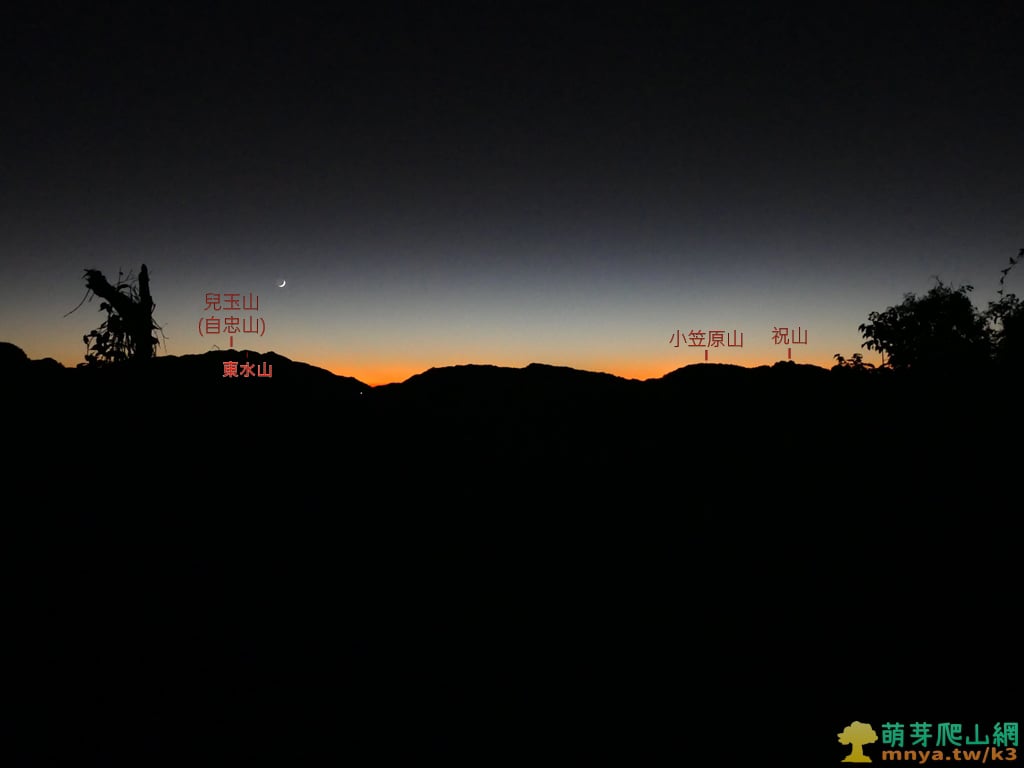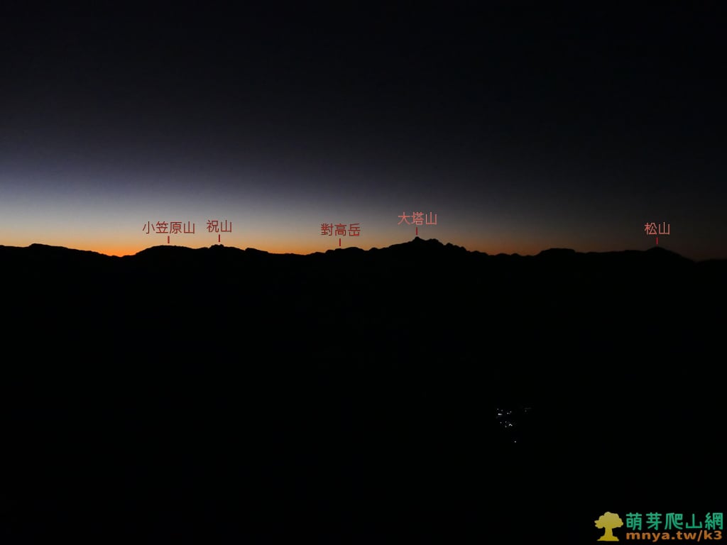 ▲眺望西邊的阿里山山脈,左至右分別可見:小笠原山(2489M)、祝山觀日峰(2484M)、對高岳(2439M)、大塔山(2663M)、松山(2557M),其中大塔山為阿里山山脈最高峰,也是小百岳中的最高峰,餘暉下只能見到山稜的背影,山下可見神阿古道起點附近農家的燈光。