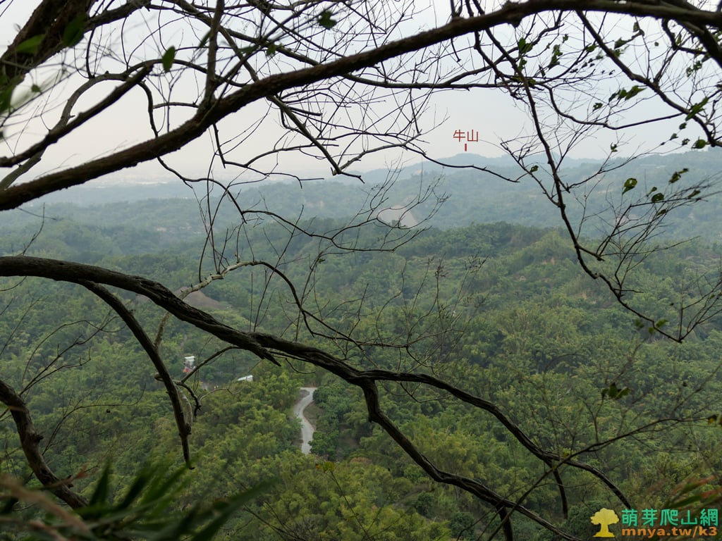 ▲尖山頂崖邊往東北俯瞰山下的水泥農路,眺望柳營、東山地區的淺山丘陵,遠可見剛才爬過的牛山(212M)。