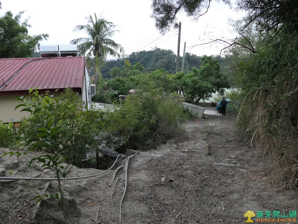 ▲踏上階梯來到駁坎上方的平台,中間有一棟廢棄的水泥建築,續行取建築右側的山徑,往平台後方的山頂走。
