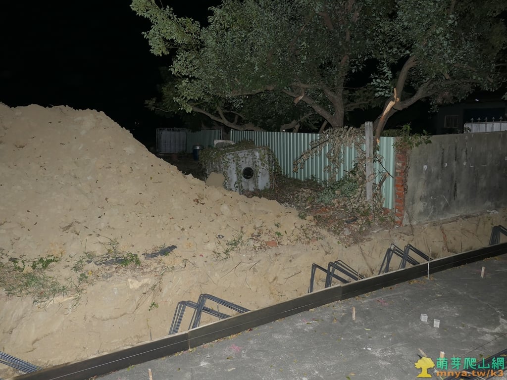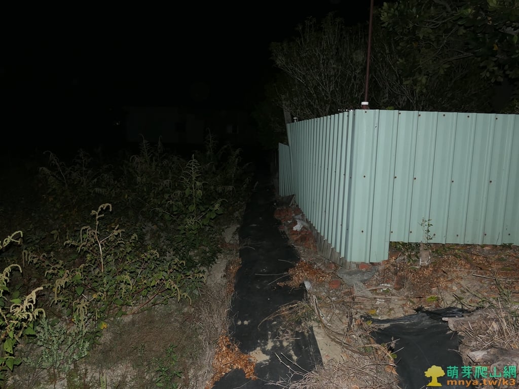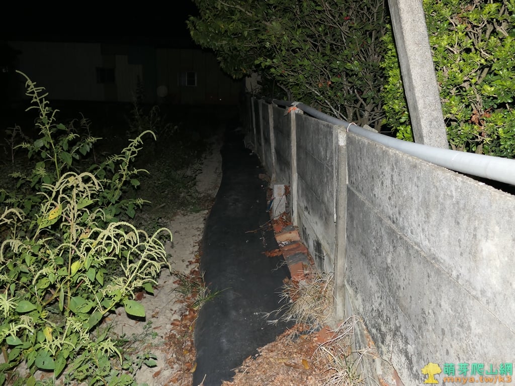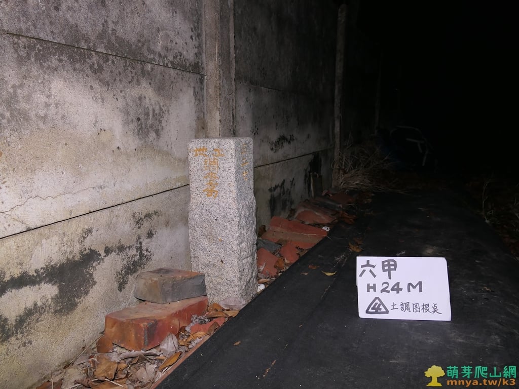 ▲於農田與民宅圍牆間的小路行,很快在圍牆邊見到六甲圖根點,由於到訪時已經日落天黑找了一下才看到基石。