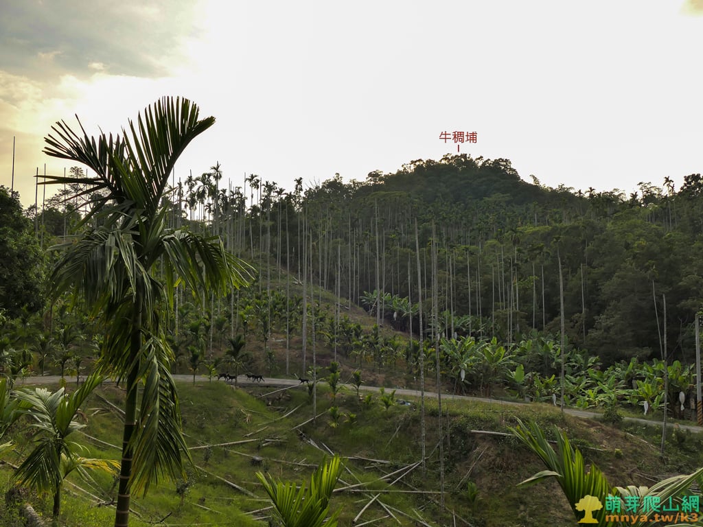 ▲從嘉136線5.288K終點行1.7K岔路口停車,續行的柏油路轉下坡不通,可見到一群黑狗浩浩蕩蕩的走來,前方拔起的山頭即目標牛稠埔(201M)。