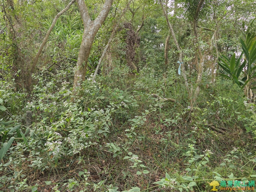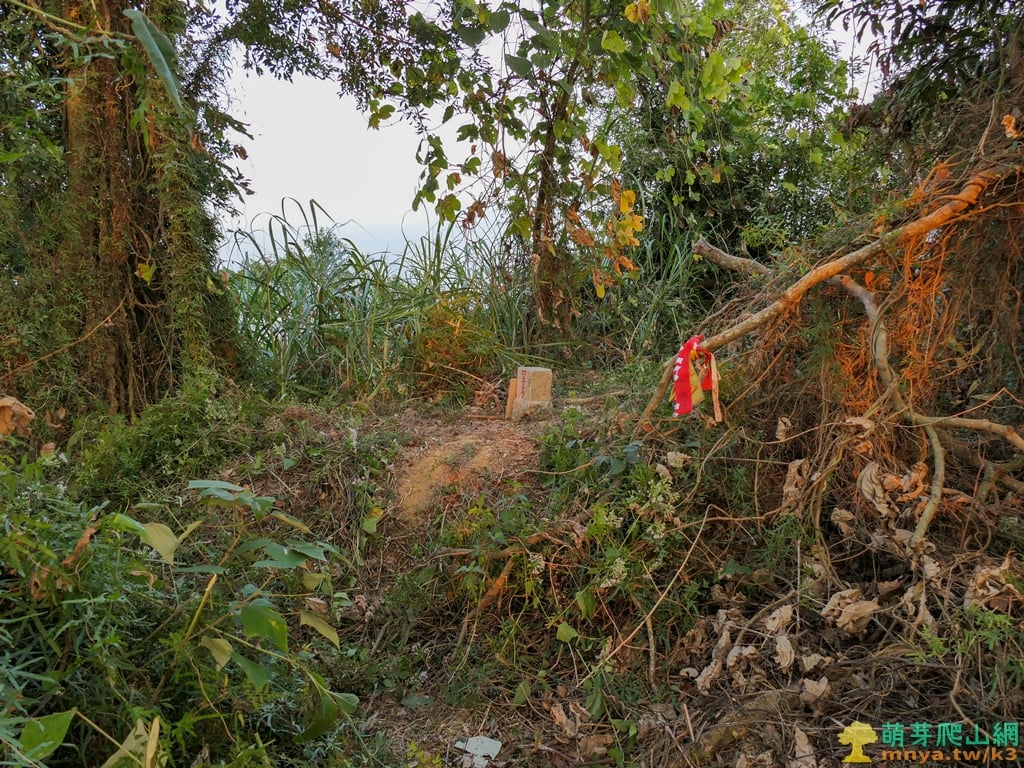 ▲至山頂前草坡的分岔口,原有山徑從左繞一圈到三角點處,在此直接取直突破雜草倒木即可直達點位。