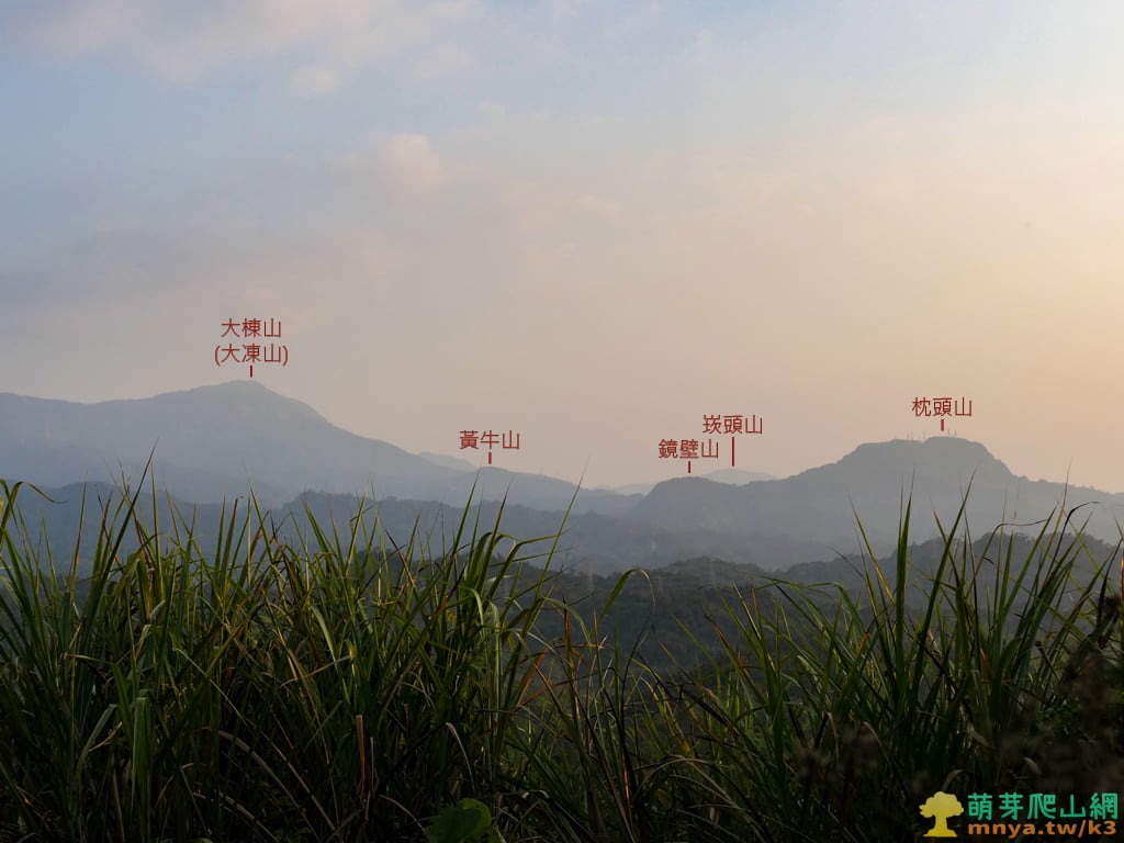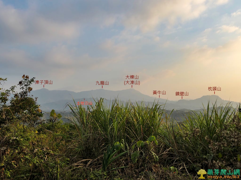 ▲山頂前草坡往東南方眺望阿里山山脈稜線,北至南可見:凍子頂山(1179M)、九龍山(1219M)、大棟山(大凍山;1241M),山稜之前可見土地公山(590M),右側可見關仔嶺附近的黃牛山(657M)、鏡壁山(496M)、枕頭山(645M)等地。