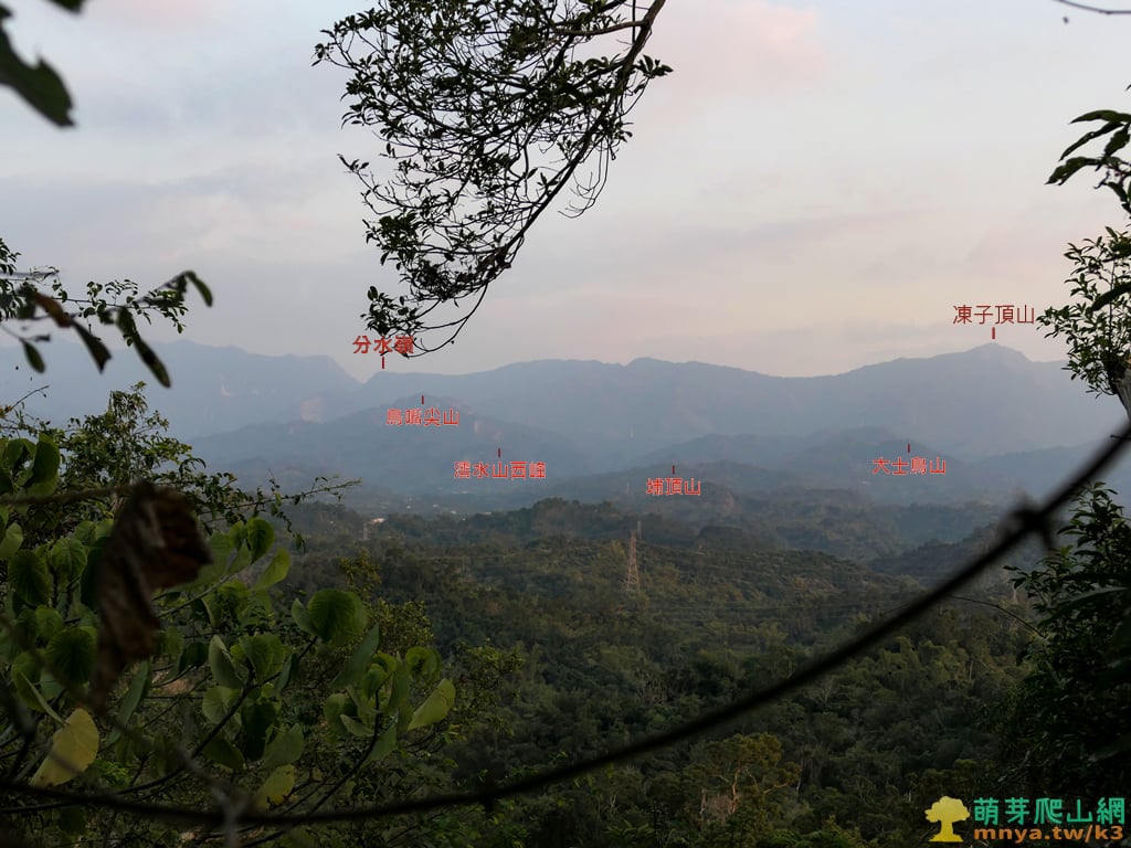 ▲向東偏南眺望阿里山山脈南往北可見凍子頂山(1179M)與分水嶺(940M),分水嶺北邊即台3線越嶺鞍部,山稜前可見鳥嘴尖山(678M)、澐水山西峰(407M)、埔頂山(245M)、大士鳥山(484M)等小山頭。
