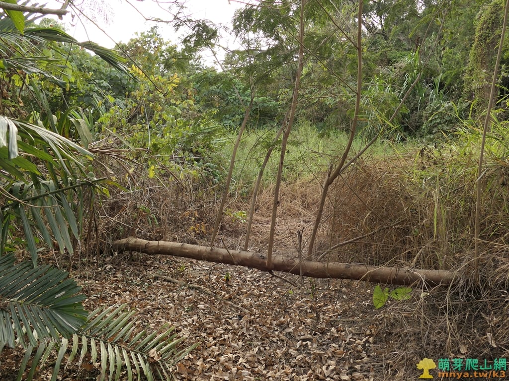 ▲跨越橫長的樹木後小路向右彎,路左有一面鹿寮溪水庫禁止傾倒垃圾告示牌,直行方向是嘉136線通往中庄方向,雜草叢生已完全無路可走。