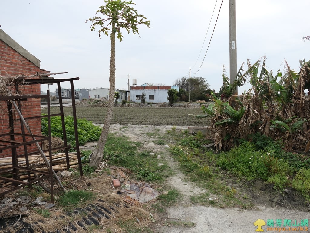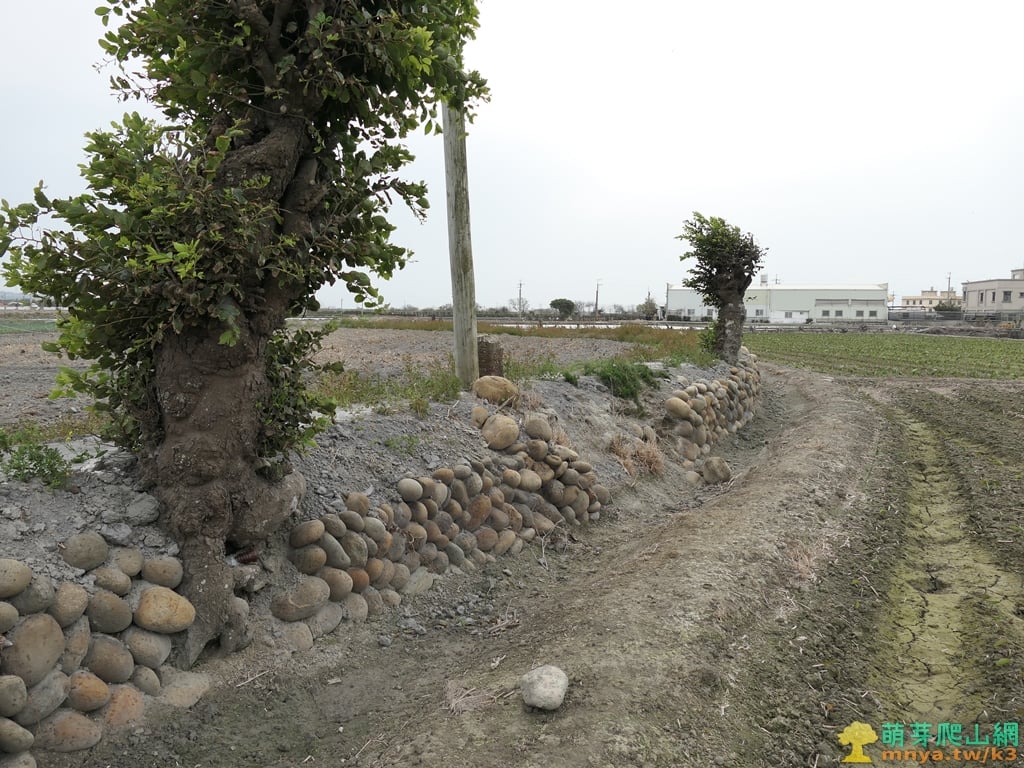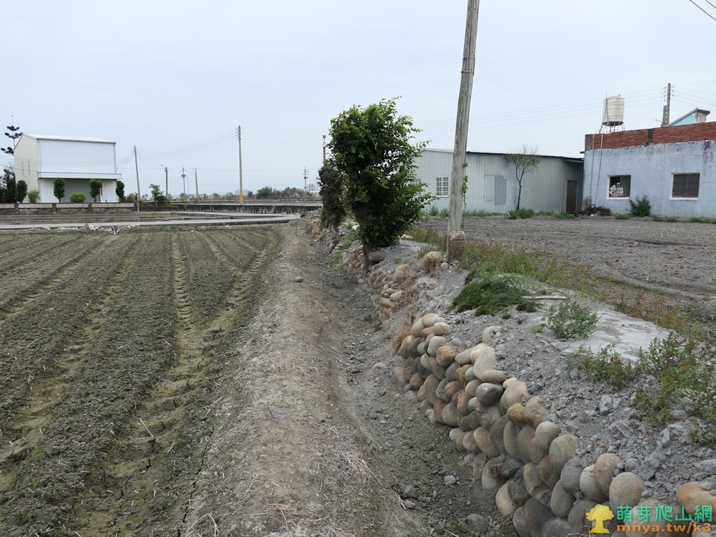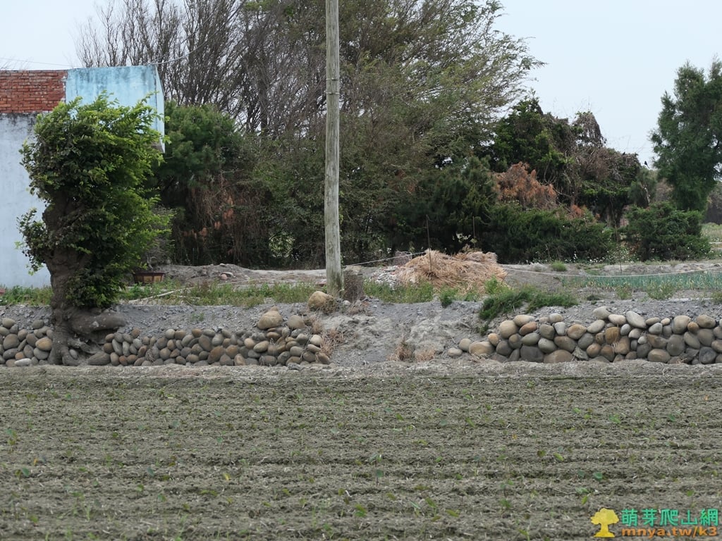 ▲從低處的田邊回拍基石位置,周圍平坦風勢強勁,不時還會飄起陣雨,拍完照後原路回車。