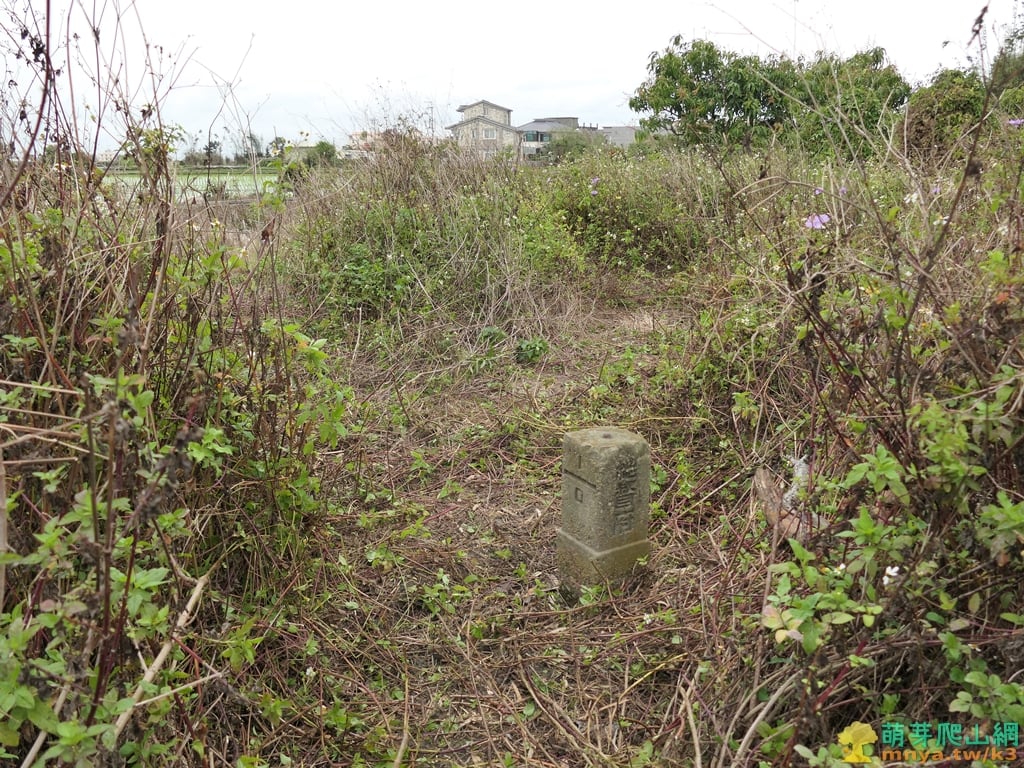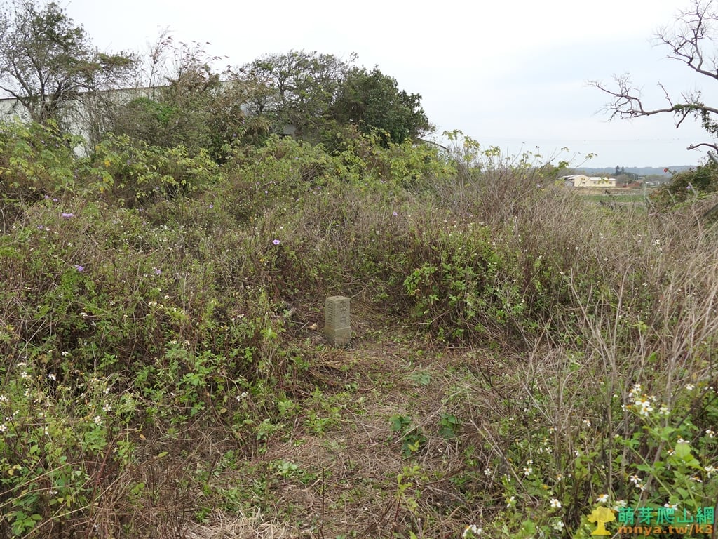 ▲於雜草叢生的菜園荒地中見到基石,近期剛有山友來過很快就找到了,來程走約5分鐘。