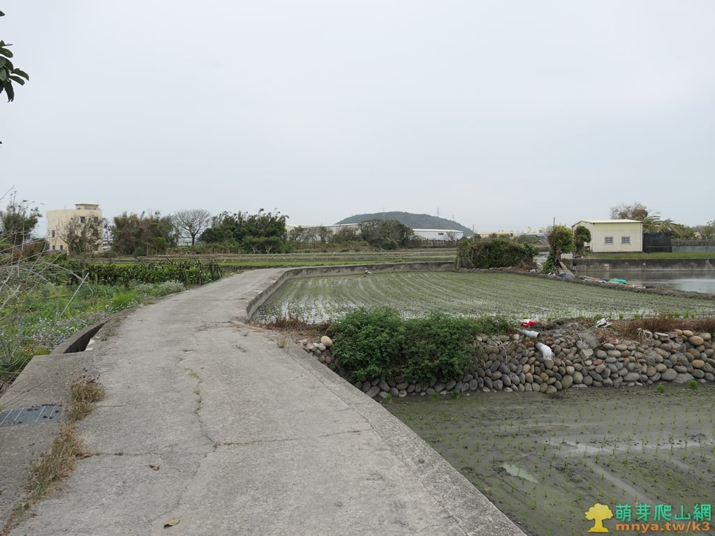 ▲續行田間狹窄的水泥路,往前方鐵皮屋行,遠處可見位於大甲溪北岸的內水尾山。