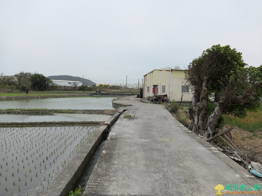 ▲順稻田邊水泥路行經鐵皮屋,一旁的稻田正在插秧。