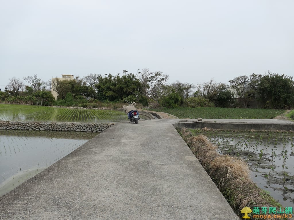 ▲沿水泥路走約0.2K岔路取左,再走20公尺取直入水溝旁田間土路,距離基石剩40公尺。